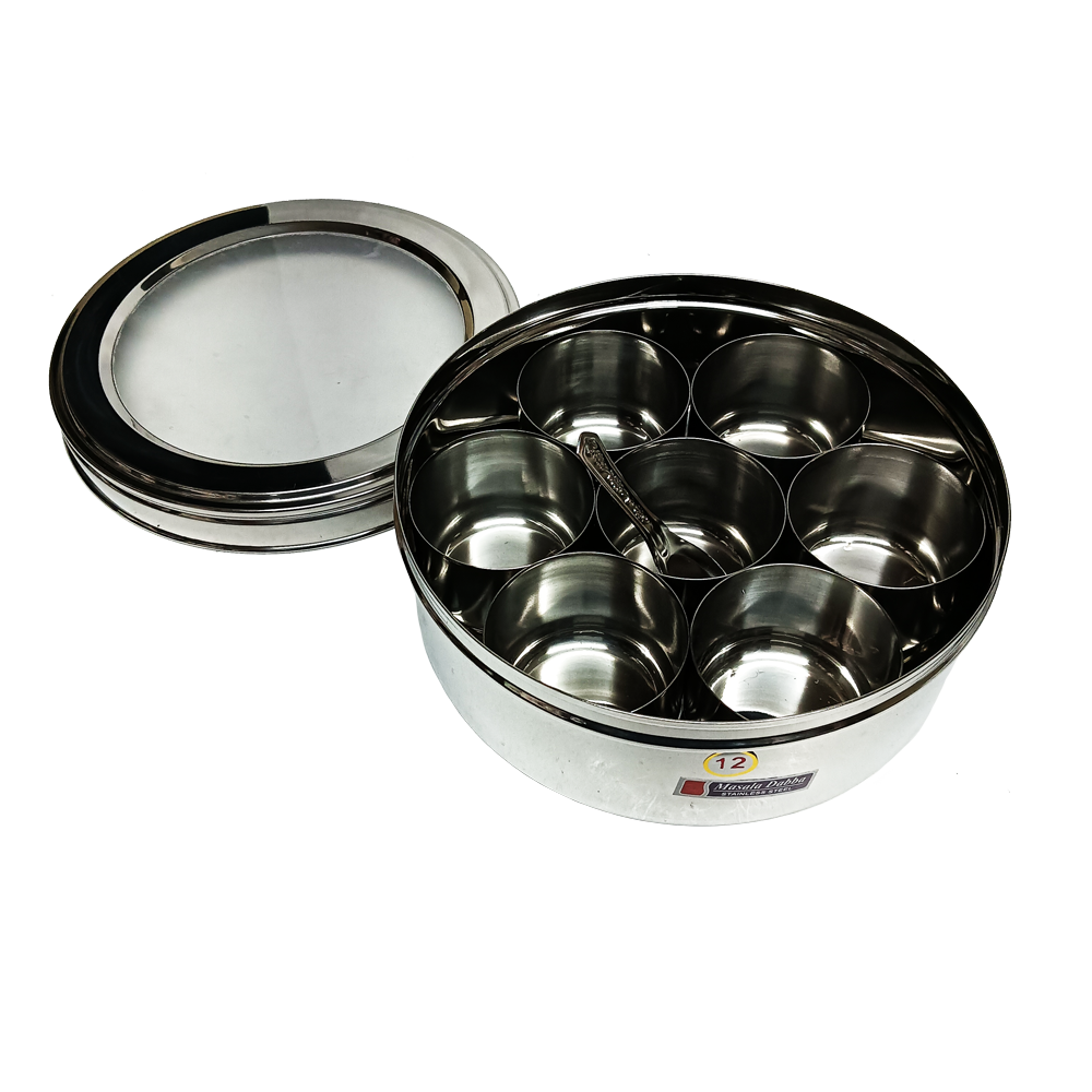 A masala dabba holder, or spice box, is a traditional Indian stainless steel container used to store and easily access common spices for everyday cooking.