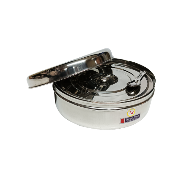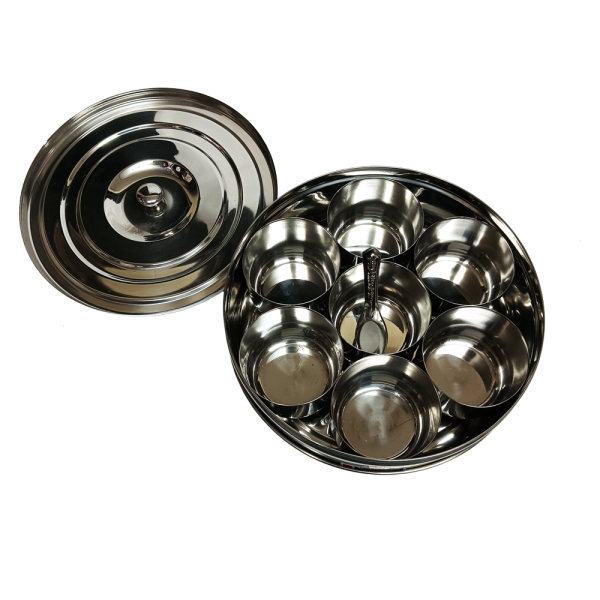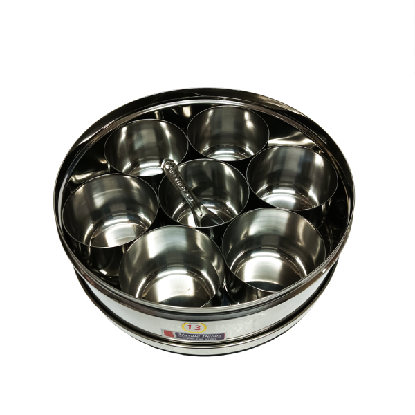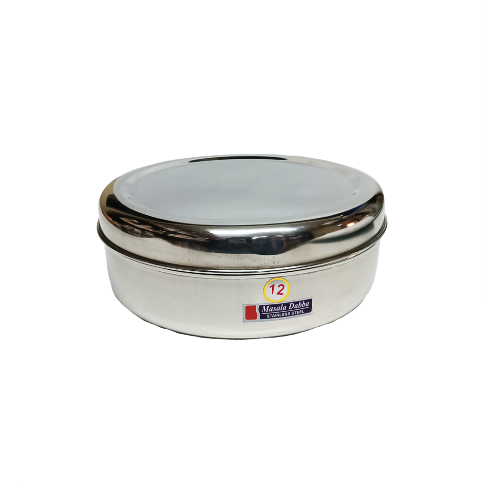 A masala dabba holder, or spice box, is a traditional Indian stainless steel container used to store and easily access common spices for everyday cooking.